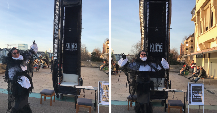 Es geht nicht nur ums Klima, bei Willi Paul Paulussens Kunstprojekt «Klima-Beichtstuhl». Der hohe schwarze Turm, natürlich mit dem Velo transportierbar, war im Dezember an verschiedenen Standorten in der Basler Innenstadt zu sehen. Willi Paul Paulussen sitzt da, als Kunstfigur Para Dada in seinem dunklen Tüllkostüm, und wartet. Manchmal dauert es eine Weile, bis sich die Baslerinnen und Basler trauen. Manchmal kommen sie sofort. Jedes Mal ist es anders und jedes Mal sind auch die Geschichten andere.